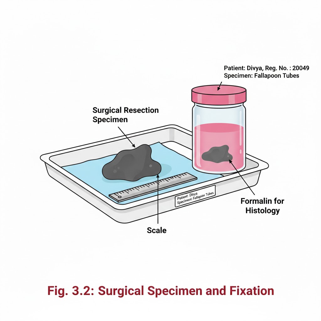 INTRODUCTION:- In the laboratory setting, numerous histological specimens are received throughout the day for testing. It is important to maintain a systematic approach to ensure that all samples are accounted for and are being received and tested appropriately. Without it, there is a potential to misplace or lose samples. OBJECTIVES:-After reading this lesson, you will be able to:- *explain the process of receiving surgical specimens *describe preparation of gross room *receive the samples, label the sample and store. RECEIVING OF SURGICAL SPECIMENS:- At the time of receiving the specimens, following points should be checked and these points must match between requisition form and label on the sample container. 1. Name of the patient 2. Sex and age of patient 3. Registration no, OPD or indoor number 4. Type of sample like appendix or lymph node. After matching the above points carefully, accession number of the Histopathology laboratory should be given on the requisition form and on the sample container like it has been depicted in the form and sample bottle. A register should be maintained for record and for future reference Following points should be noted on the register (sample given) 1.Date 2.Accession number which was given by the pathology department. 3.Patients name, age, sex. 4.Patients registration number/ OPD/ indoor number. 5.Type of sample. 6.Number of samples received from one patient. 7.Remarks / final diagnosis which may be entered later on. After receiving the samples the consultant should be informed for grossing. If grossing to be done after some time, fixative should be put in all the samples to prevent autolysis of the specimen. PREPARATION OF GROSS ROOM:- The routine work associated with a surgical pathology specimen includes gross and microscopic examination. Proper preservation of tissues and processing of the tissue are the most important aspects for correct diagnosis. The size and features of the gross room depends on the number of specimens and type of institution. Gross room should be well illuminated and ventilated.It should have a gross station and racks to keep the specimen in order of accession number. Gross station – It should have ventilated hood. 1. Cutting board placed inside the metal box designed in such a fashion that all the fluids should flow directly into the sink 2. Ready access to sink with hot & cold water 3. Formalin – stock and 10% buffered formalin 4. Box of instruments containing (a) Scissors (b) Forceps (c) Malleable probe (d) Scalpel handle with disposable blades (e) Long knife (f) Scale (g) Pins for attaching the specimens to corked surface if required 5. Containers with different fixatives 6. Bone cutter 7. Large disposal bin 8. Box with cassettes and labels These are the essential items. Depending upon the pathology service being rendered to the institution more sophisticated items may be added. Apart from the above items following items may be of help in keeping the records 1. Photographic facility 2. Refrigerator 3. Balance to weigh the gross specimen 4. X-ray view box 5. Other equipments for tissue bank facility.